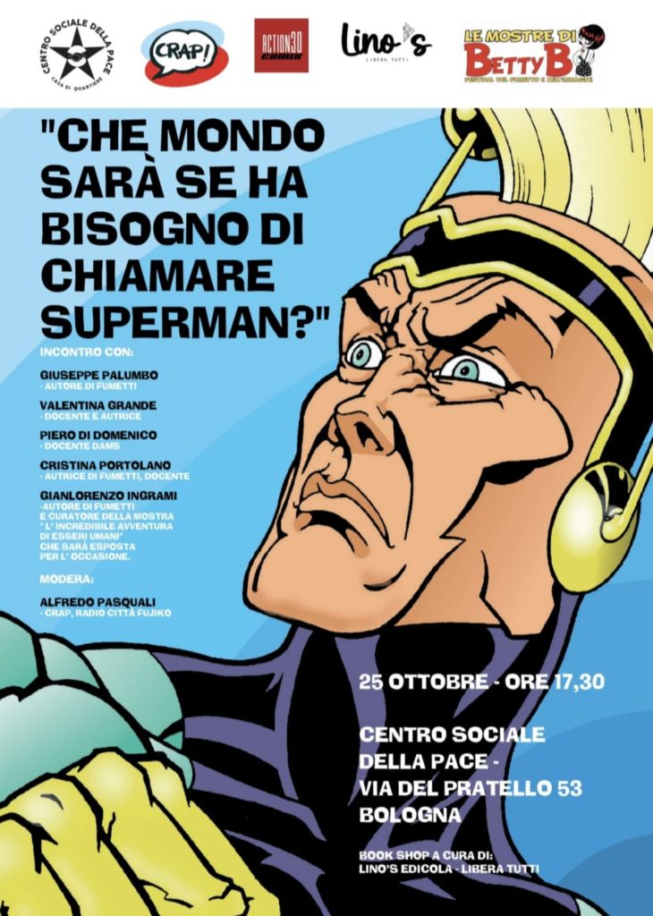 Dal 25 ottobre ore 17,30 al Centro Sociale della Pace (Via del Pratello 53) troverete la mostra supereroistica "Che mondo sarà se ha bisogno di chiamare Superman". La mostra sarà visitabile fino al 6 novembre.