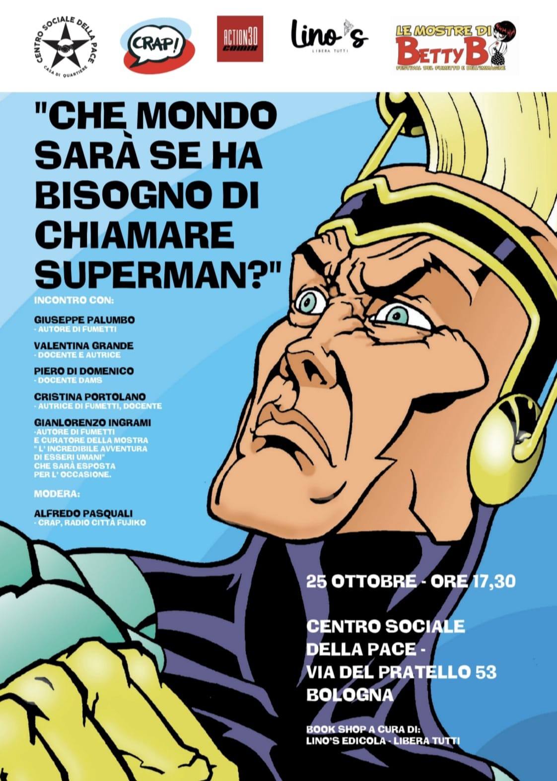 Dal 25 ottobre ore 17,30 al Centro Sociale della Pace (Via del Pratello 53) troverete la mostra supereroistica “Che mondo sarà se ha bisogno di chiamare Superman“. La mostra sarà visitabile fino al 6 novembre.